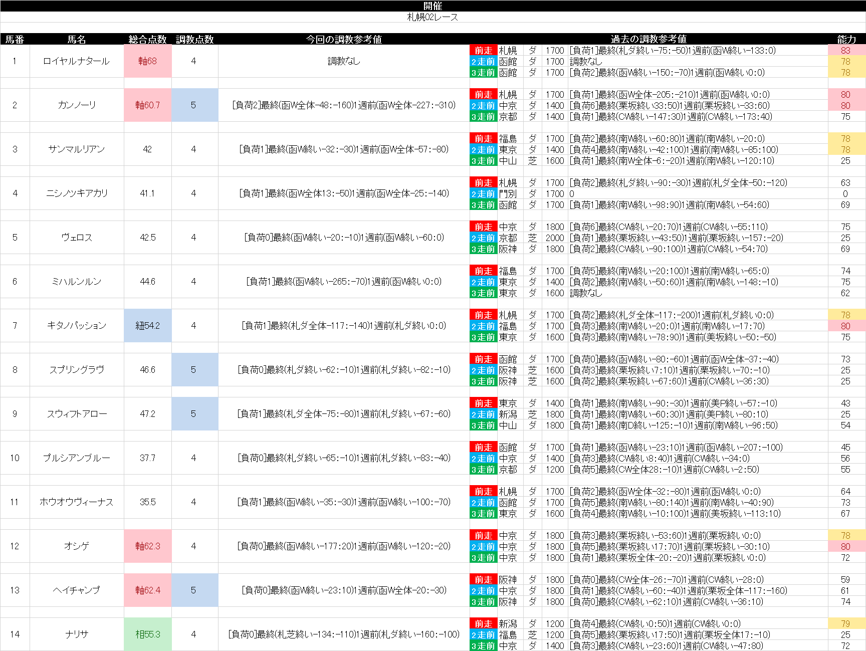 最終追い切りの動きはダートでもいけそうなほど力強いフットワークで、いかにもパワー型という感じがしますし、最終週の札幌という舞台も合っていそうな感じがします。