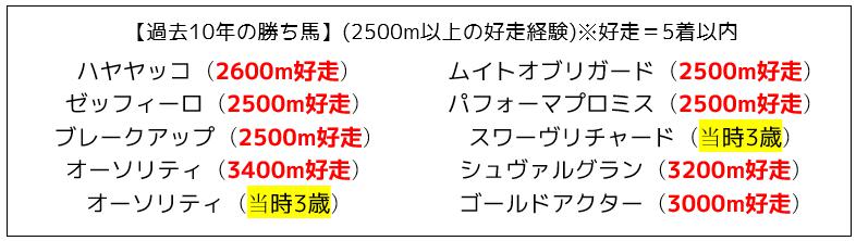 過去10年の勝ち馬は、2500m以上で好走経験のある馬が多くなっていました。