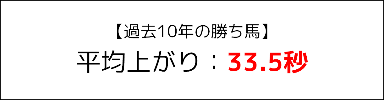 ここで勝ち馬の平均上がりタイムを確認すると、33.5秒という非常に速いもので、このレースは東京競馬場らしい高速上がり勝負になりやすいと言っていいでしょう。