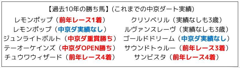 まず過去10年の勝ち馬と中京での実績を見てみると、殆どが中京競馬場で勝ったことがある。中京ダート重賞で馬券圏内もしくはこのレースで掲示板を確保したことがあるような、中京で好走歴がある馬でした。