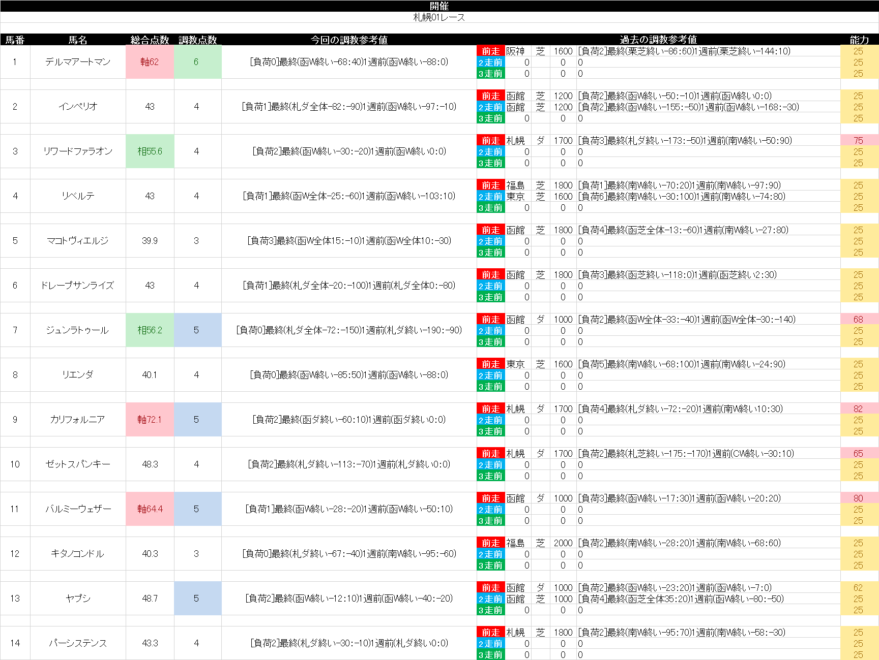| 前走レース名 | 着別度数(札幌開催時) | 勝率 | 連対率 | 複勝率 | 単回値 | 複回値 |