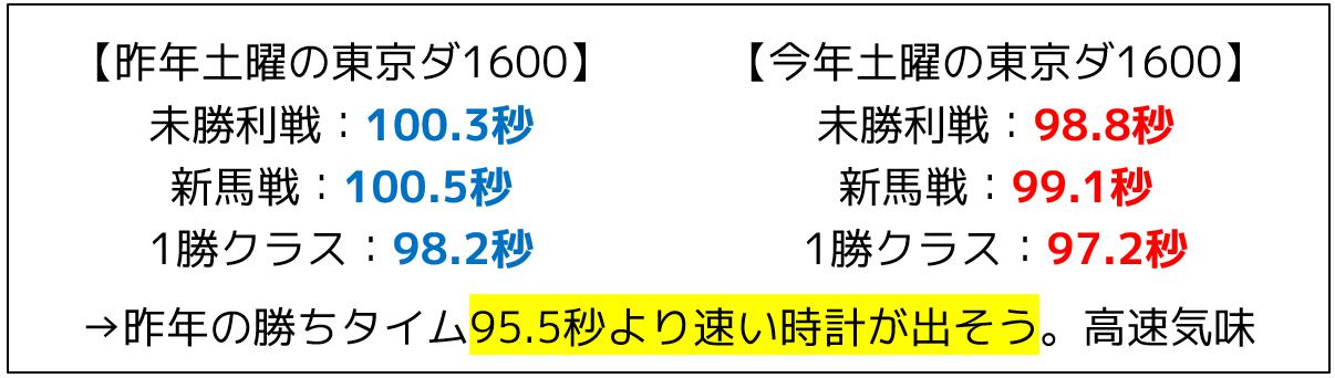 まず土曜日に行われた東京ダート1600mと、昨年の土曜日に行われた同条件のレースを比べると、今年は勝ち時計が速い傾向にあり、去年より速いタイムが出る馬場状態と言っていいでしょう。