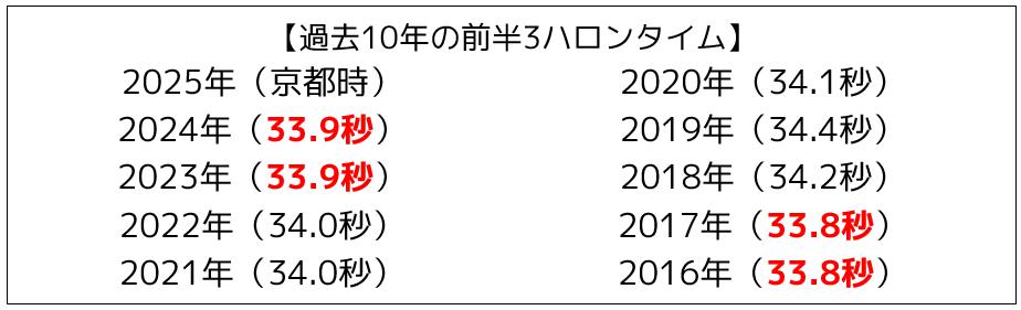 こうなっているのは、やはり開幕週というのが大きな原因でしょう。多少速いペースで行っても開幕週の馬場を味方に粘り込んでしまうというわけです。