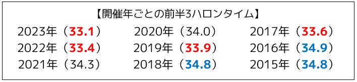 実際に近年の前半3ハロンタイムを見ると33秒台が半分程度を占めており、スプリンターが作ったハイペースに乗じて、差しが決まりやすいというわけです。