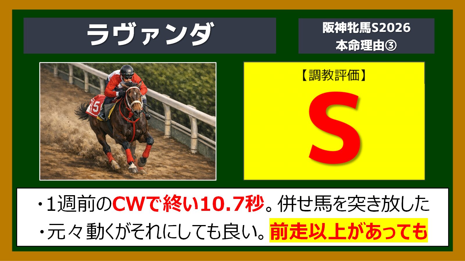そこで本命にしたのがラヴァンダですが、この馬は追い切りの内容も申し分ありません。