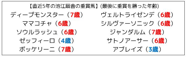 池江厩舎の重賞馬10頭が最後に重賞を勝った年齢を見ても、6~7歳になっても重賞を勝っている馬が多く、ソウルラッシュやジャンダルムに至っては6~7歳になって、初のG1制覇をするなど、高齢になって真価を発揮する馬が多いというのが分かります。
