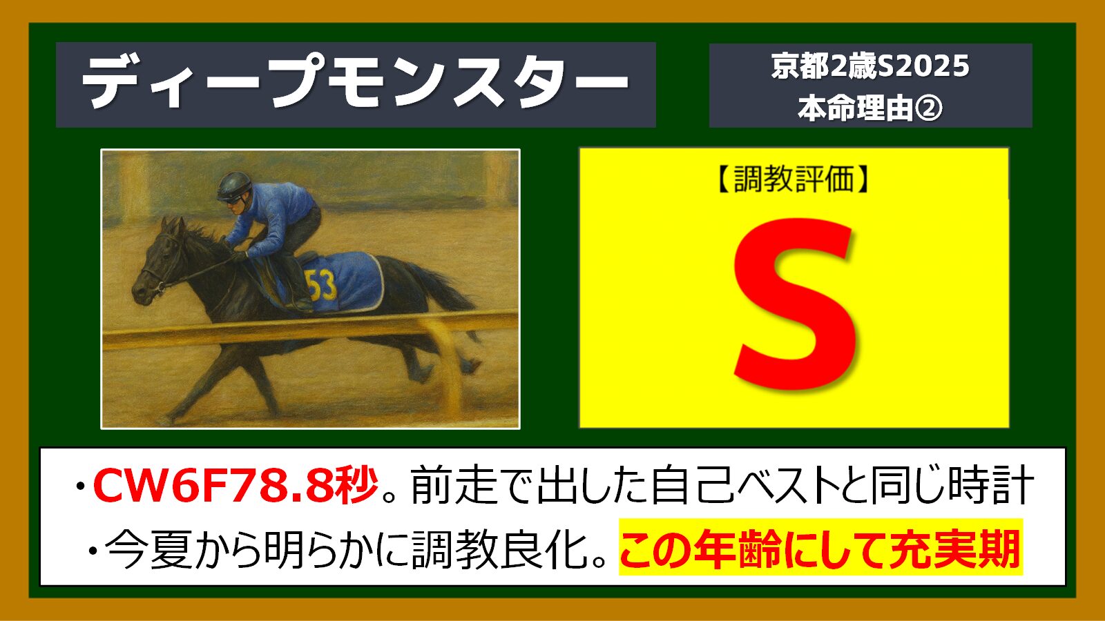 そこで本命にしたのが前走上がり2位。父ディープインパクトのディープモンスターですが、この馬は追い切りの内容も申し分ありません。