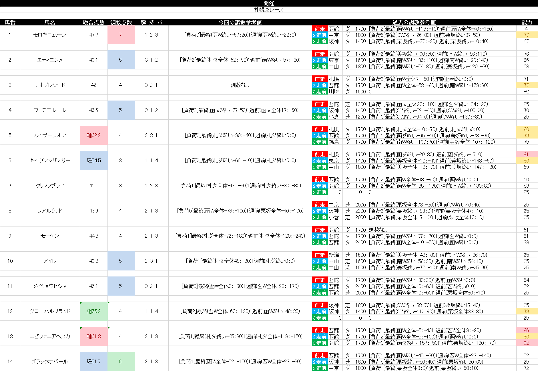前走は2着と好走しましたが、北海道では調教せず、ぶっつけ本番で挑むような形でした。今回は北海道で調整している分、前走よりはマシな状態でしょう。今回は2走前の福島テレビオープンと同じくらいの状態だと見ています。