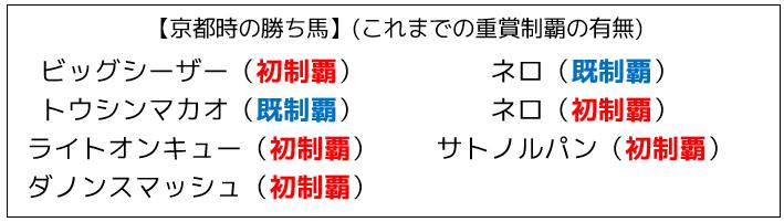 このレースが京都で行われた過去7年の勝ち馬と、これまでの重賞制覇の有無を確認すると、半分以上の馬がココで初の重賞制覇という感じになっていました。