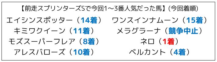 逆に前走スプリンターズステークスで今回上位人気になった馬。実績上位と言えるような馬は人気を裏切るケースが多く、好走したのは僅か1頭のみという有様です。