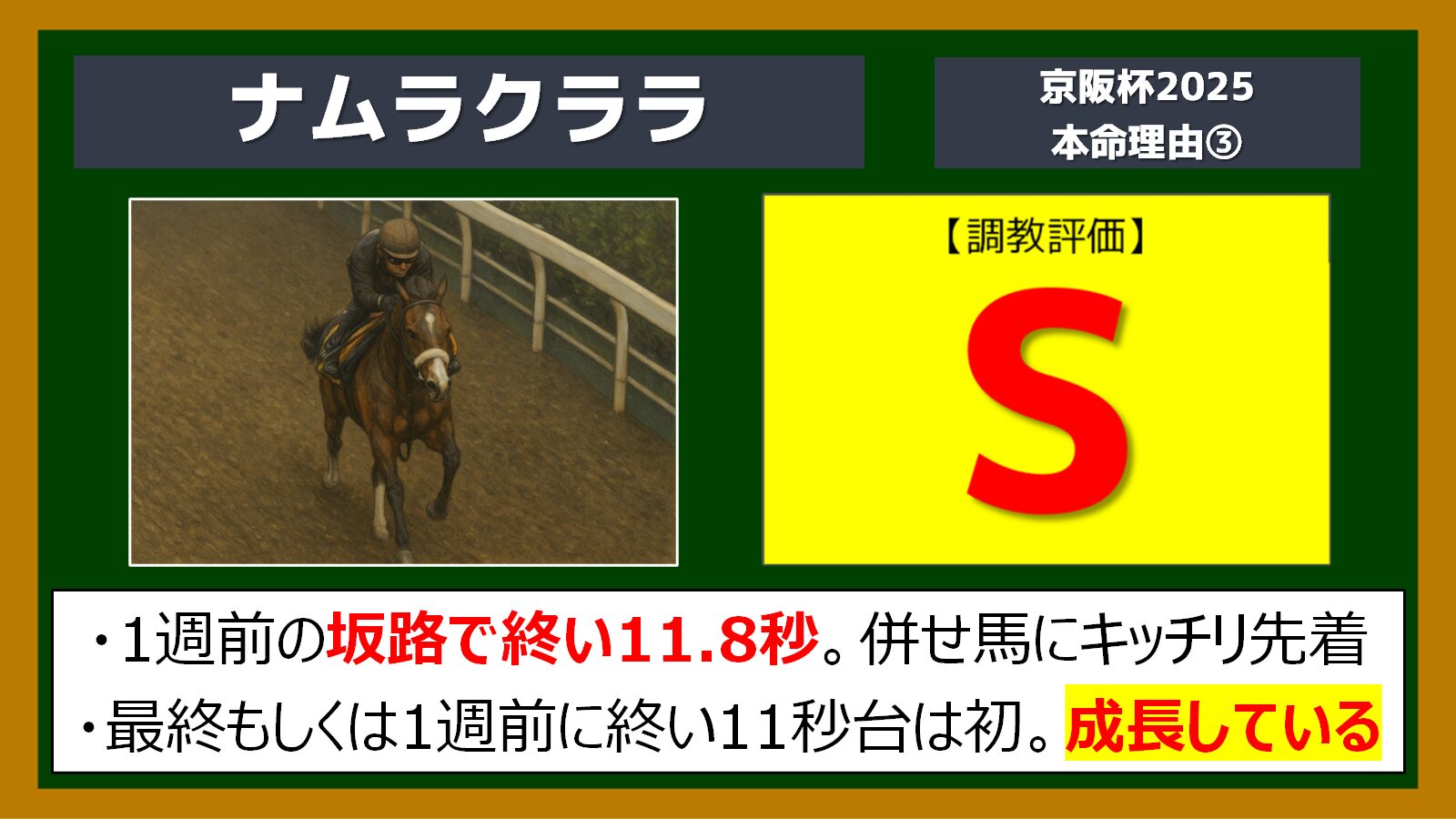 そこで本命にしたのが前走馬体重478キロ。これまで目立った実績のないナムラクララですが、この馬は追い切りの内容も申し分ありません。