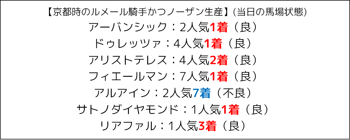 京都開催の菊花賞において、ルメール騎手がノーザンファーム生産馬に乗ってきた場合は8頭中7頭が馬券圏内。唯一の馬券圏外も歴史的な道悪になった2017年だけで、ほぼパーフェクトと言っていい成績です。青葉賞のような競馬が出来れば自然と結果はついてくるだろうと見ています。