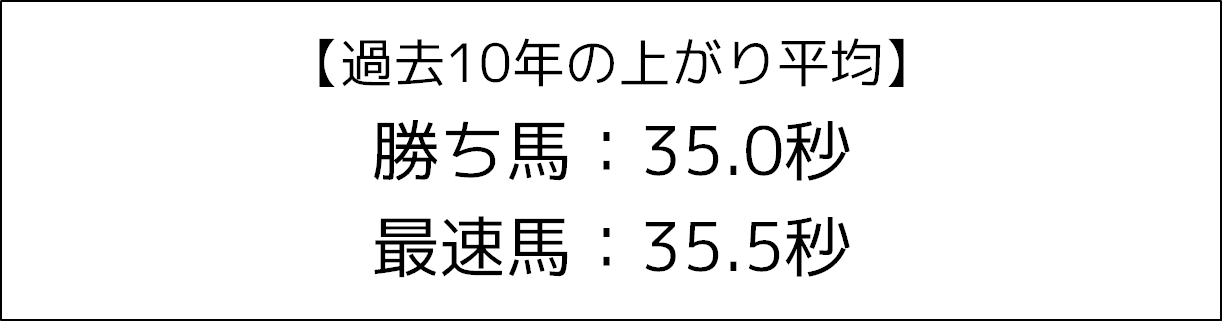 さらに過去8年の勝ち馬と上がり最速だった馬の、平均上がりタイムを確認すると、それぞれ上がり35秒台と上がりの掛かる勝負になっていました。長距離戦らしいスタミナ勝負と言っていいでしょう。