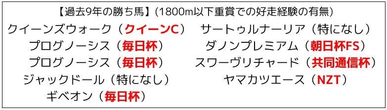 過去9年の勝ち馬は、1800m以下の重賞で好走経験のある馬が多くなっていました。