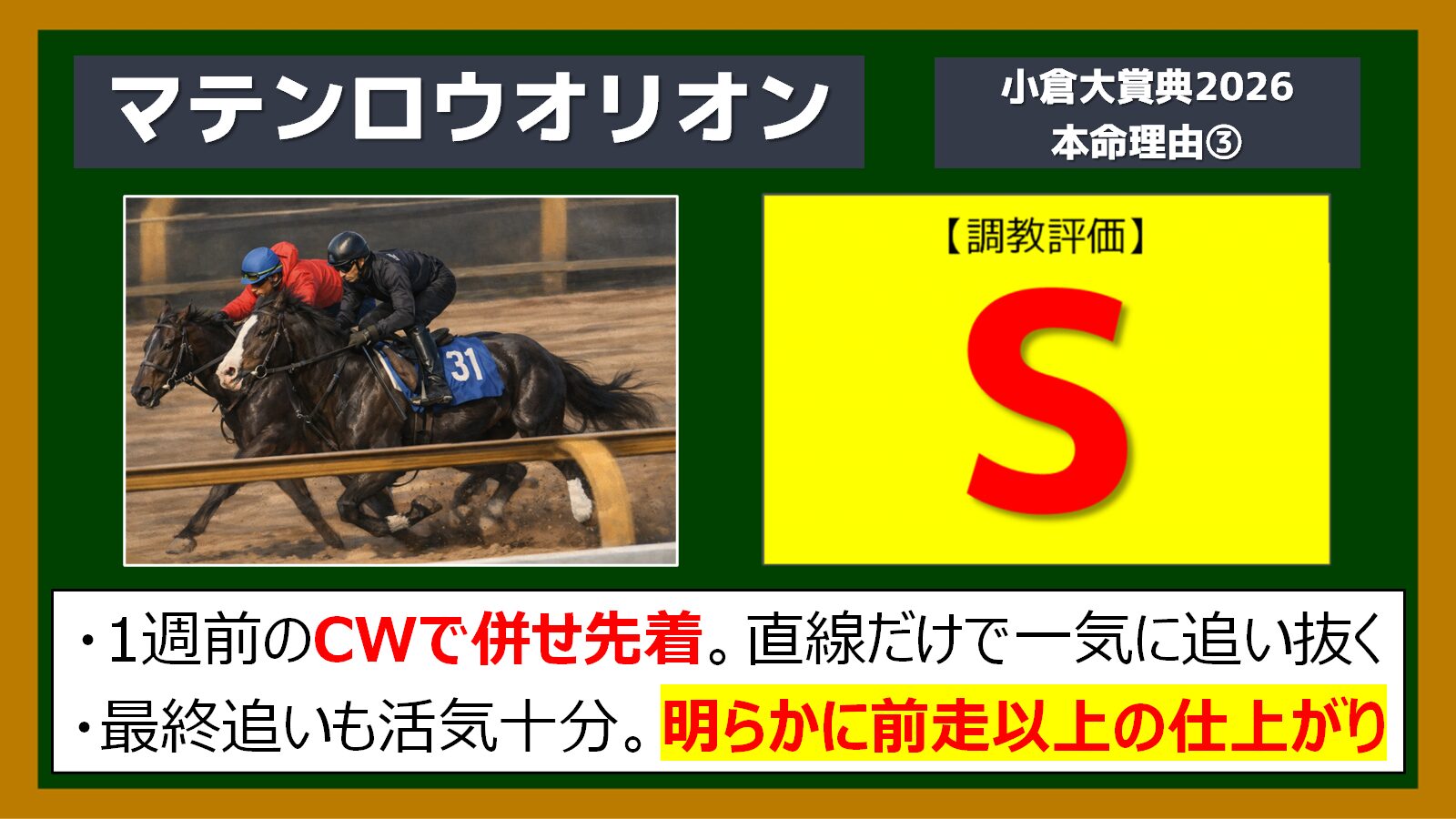 そこで本命にしたのがマテンロウオリオンですが、この馬は追い切りの内容も申し分ありません。