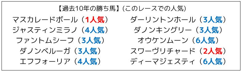 実際に過去10年の勝ち馬を並べるとジャスティンミラノ、ファントムシーフ、ダノンベルーガ、エフフォーリアなど、後の活躍馬が、この段階ではそこまで人気していませんでした。
