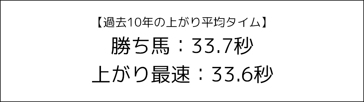 脚質データのところで「東京競馬場らしく高速上がり勝負」という話しをしましたが、それなら前走でも上がり33秒台。32秒台など高速上がりを使った馬が有利になるでしょう。