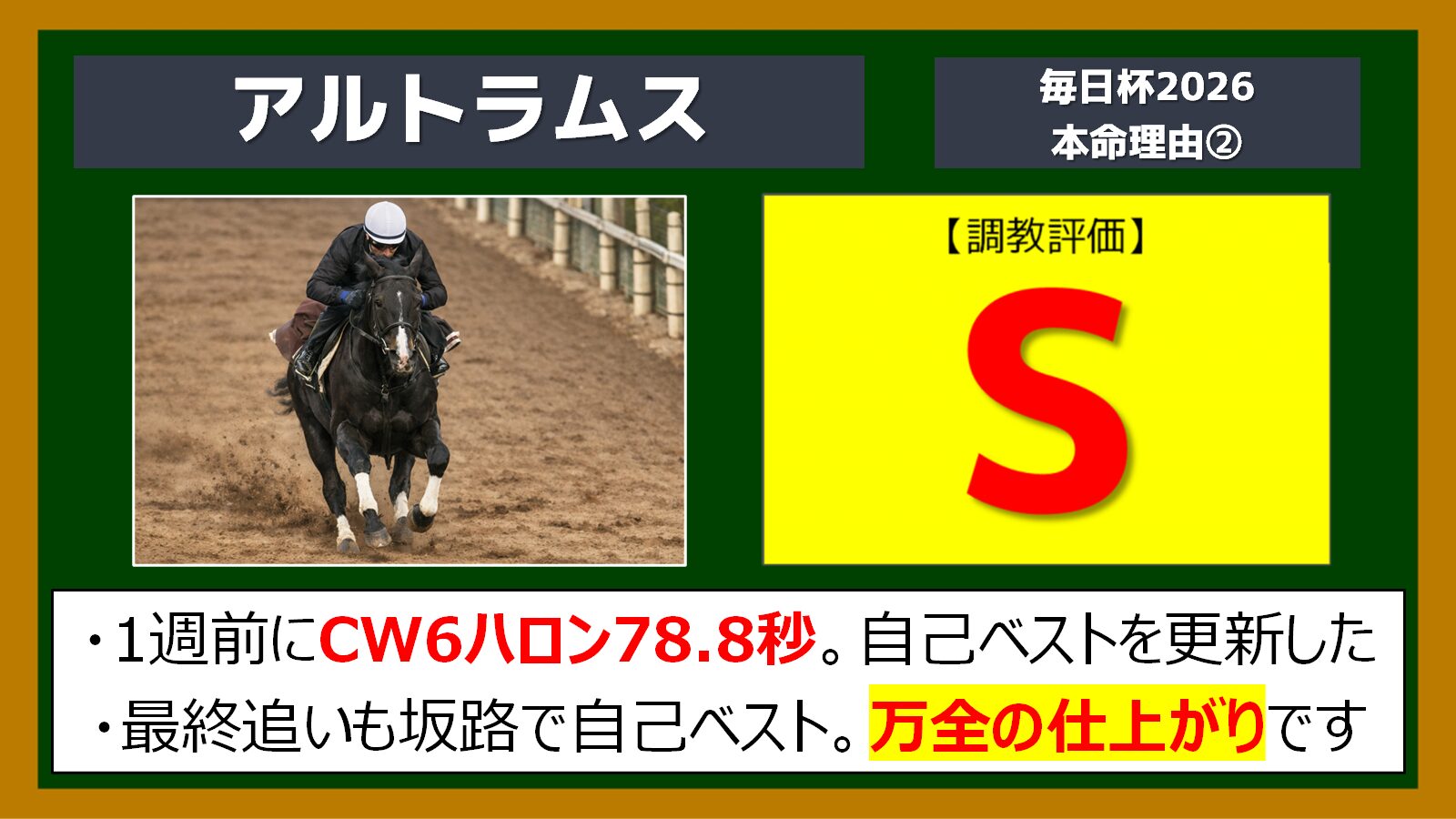 アルトラムスも自己ベスト連発が示すように、キャリアを重ねてドンドン良くなっている印象で、これまでの中で一番走ってくる可能性は高いと見ています。