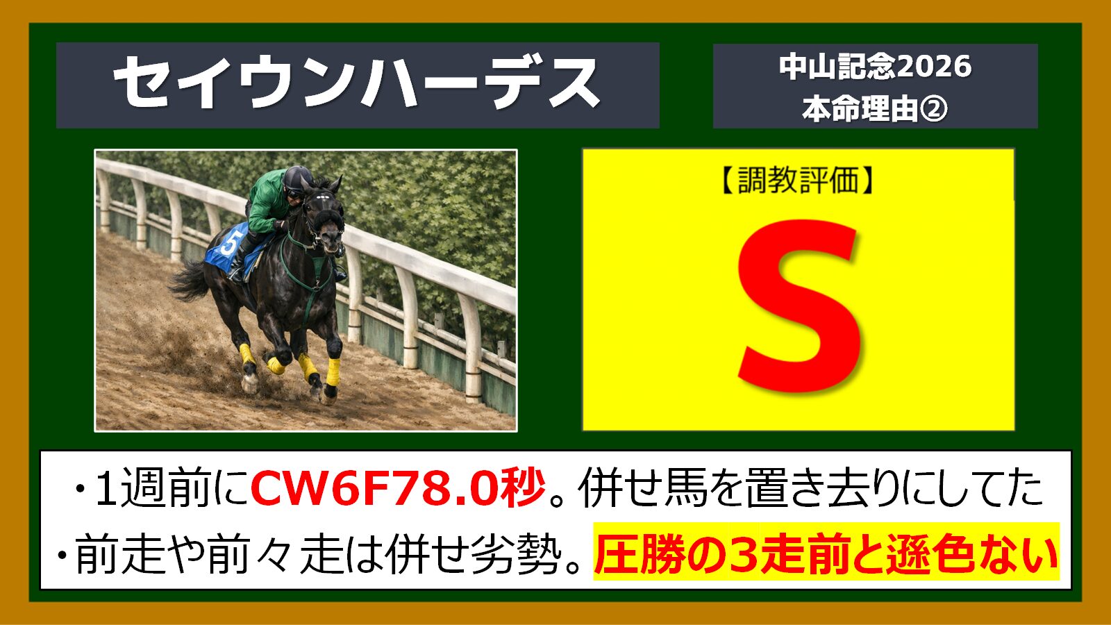 そこで本命にしたのが1枠1番を引いたセイウンハーデスですが、この馬は追い切りの内容も申し分ありません。