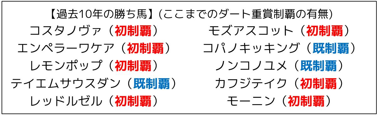 過去10年の勝ち馬と、ここまでのダート重賞制覇の有無を確認してみると、勝ち馬の半分以上がココで初の重賞制覇となっており、この時点ではあまり実績のなかった馬たちです。