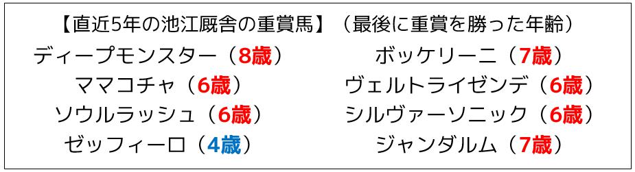 近年の池江厩舎の重賞馬8頭が、最後に重賞を勝った年齢を見ても、6~7歳になって重賞を勝っている馬が多く、ソウルラッシュやジャンダルムに至っては6~7歳になって、初のG1制覇をするなど、高齢になって真価を発揮する馬が多いというのが分かります。