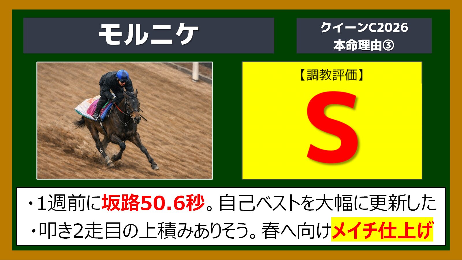 今回は叩き2走目の上積みがありそうで、このレースへ向けて万全の状態です。ここでの賞金加算を狙ってメイチの仕上げと言ってもいいかもしれません。