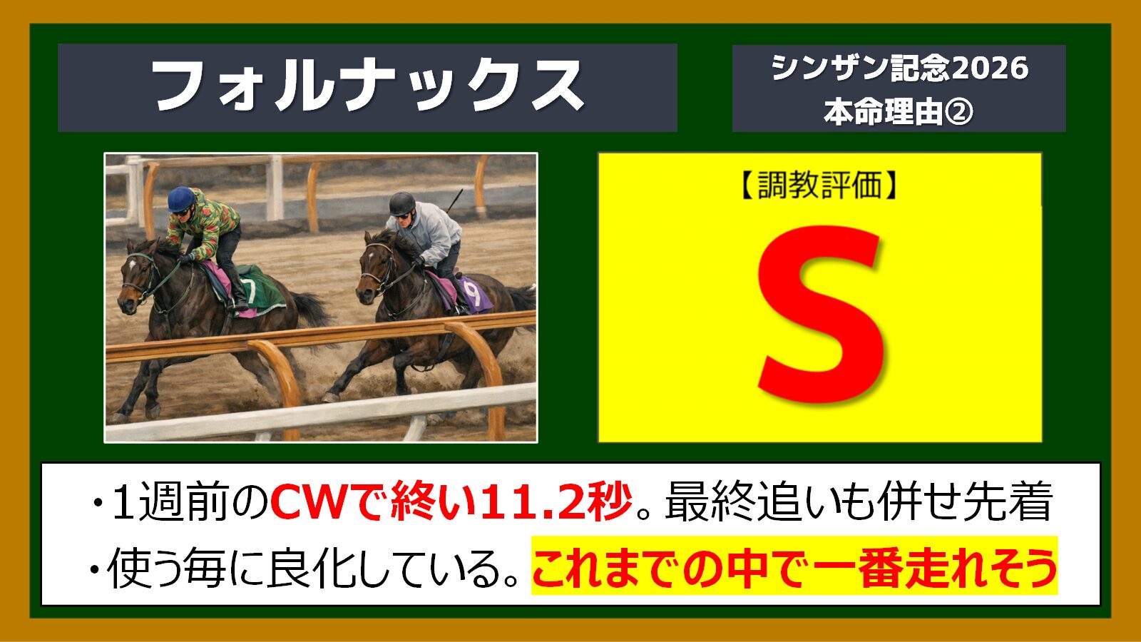 今回の追い切りを見ても、キャリア4戦目で更にパフォーマンスを上げるだろうと見て、この馬を本命にしたいと思います。