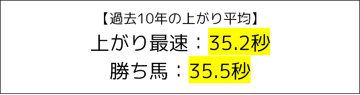 実際に上がり1位の平均上がりタイムは35.2秒。勝ち馬も35.5秒と、いずれも上がり35秒台と遅いものになっていました。