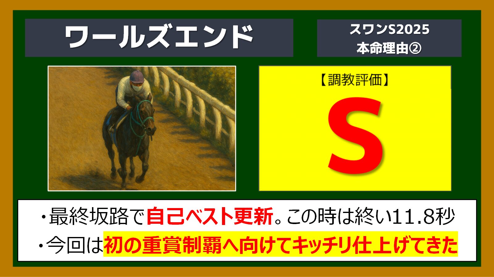 そこで本命にしたのが内枠を引いた上に、前に行けるであろうワールズエンドですが、この馬は追い切りの内容も申し分ありません。
