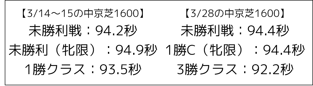 まず土曜日に行われた中京芝1600mの勝ちタイムを見ると、未勝利戦で94.4秒、3勝クラスでは92.2秒と、この舞台としては非常に速い勝ちタイムになっていました。