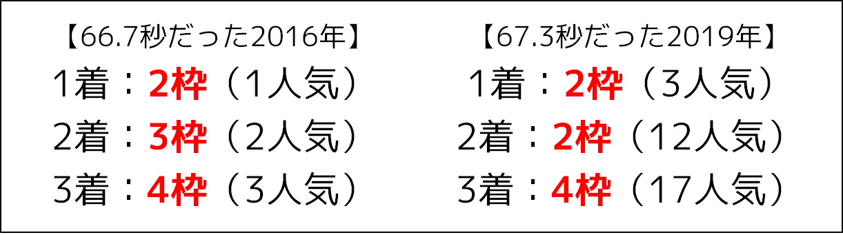 実際に67.5秒以下の勝ちタイムだった2016年と2019年の結果を見ると、2016年は内枠の人気馬で上位独占。2019年は内枠の人気馬だったミスターメロディが勝利。2~3着は内をロスなく立ち回った人気薄が食い込むなど、これまた内枠で上位独占という感じでした。