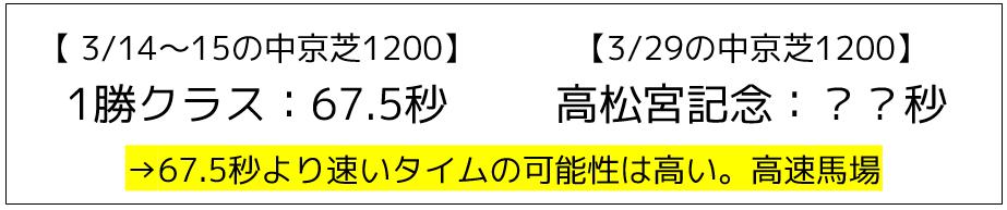 開幕週に行われた1勝クラスの中京芝1200mが67.5秒だったことを考えると、今年の高松宮記念はそれより速いタイム。67秒台前半もしくは66秒台の決着になる可能性が高いです。