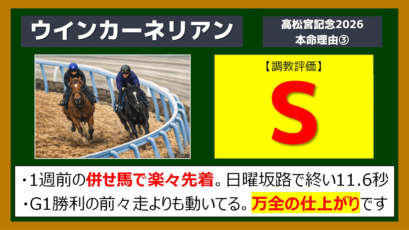 そこで本命にしたのが内枠かつ先行力もあり、非サンデー系のウインカーネリアンですが、この馬は追い切りの内容も申し分ありません。