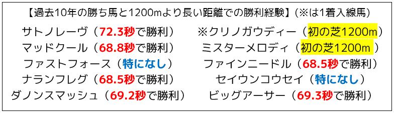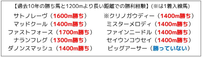 過去10年の勝ち馬は、1200mより長い距離を勝ったことがある馬ばかりです。