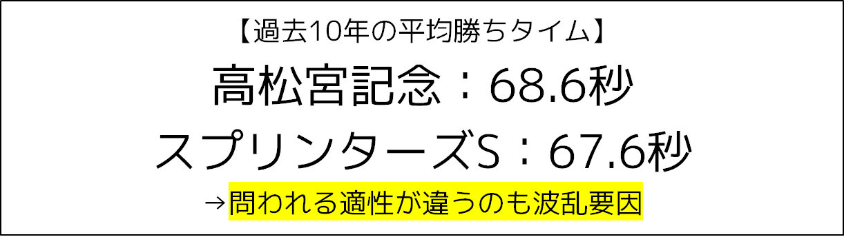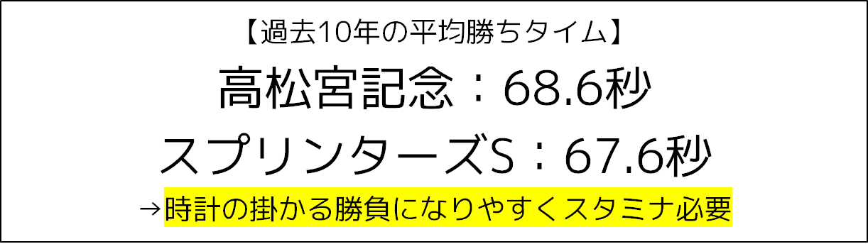 スプリンターズステークスと、このレースの平均勝ちタイムを比べると、スプリンターズステークスが67.6秒に対して、高松宮記念68.6秒と、1秒ほど遅いものになっています。