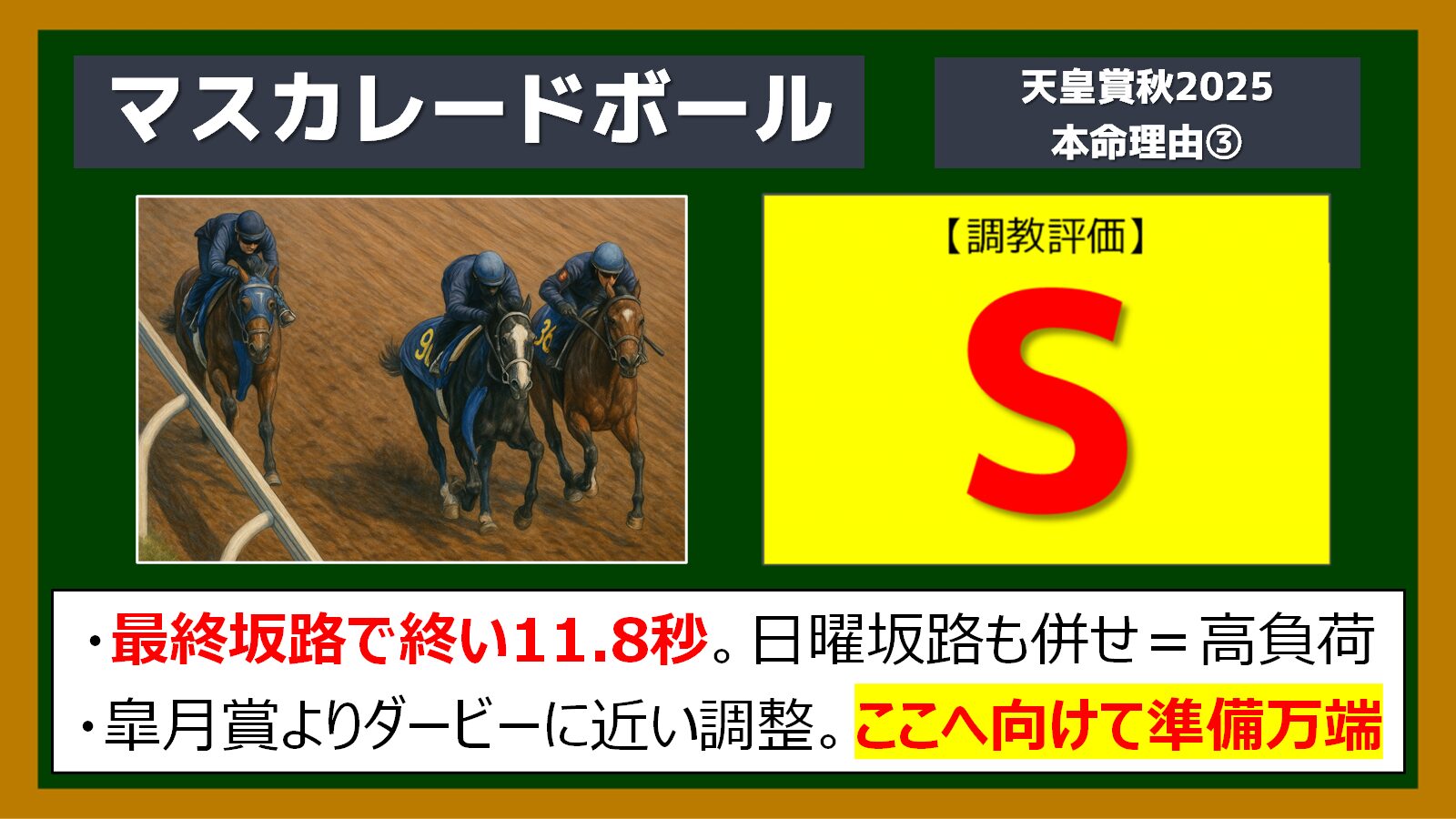 そこで本命にしたのがダービーで上がり2位。今年の3歳でもトップクラスの実力を見せていたマスカレードボールですが、この馬は追い切りの内容も申し分ありません。