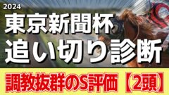 中3週と間隔が詰まっての出走ですが1週前に終い11.4秒。抑えきれない手応えで回ってきて、手前を替えると一気に伸びていく動きが出来ていました。最終追い切りこそ軽く流す程度でしたが、1週前の段階でキッチリ仕上がっているでしょう。