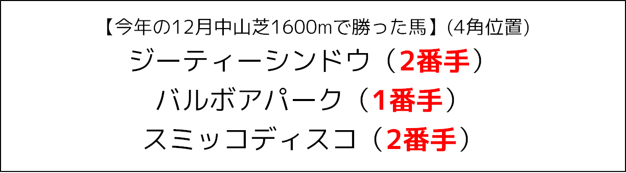 今開催の中山芝1600mの勝ち馬を見ても、4コーナーで2番手、1番手、2番手の馬という感じで、勝ち切るまでになると非常に高い先行力が必要になっていました。