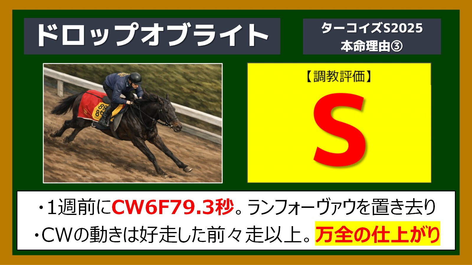 そこで本命にしたのがドロップオブライトですが、この馬は追い切りの内容も申し分ありません。